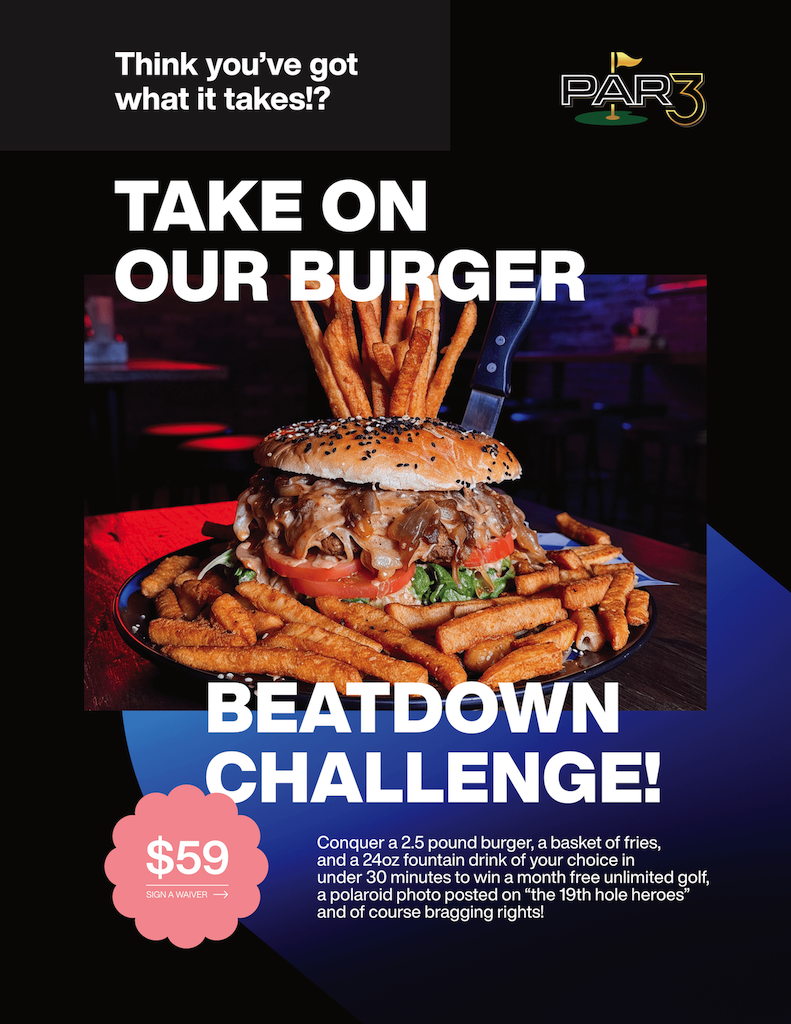 Conquer a 2.5 lb burger, a basket of fries, and a 24 oz fountain drink of your choice in under 30 minutes to win a month free unlimted golf, a polaroid photo posted on ‘the 19th hole heroes” and of course bragging rights!
