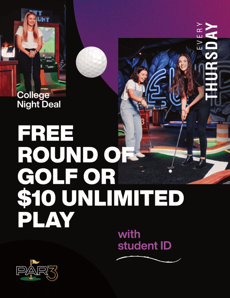 Free round of Golf or $10 Unlimited Play with Student ID. Every Thursday.